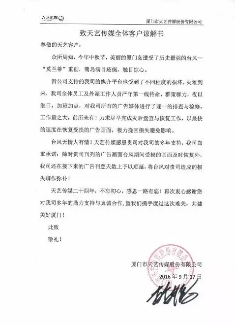臺(tái)風(fēng)無(wú)情人有情!天藝傳媒感恩貴司對(duì)我司的多年支持,我司鄭重承諾:除對(duì)貴司刊列的廣告畫面臺(tái)風(fēng)期間受損的畫面及時(shí)恢復(fù)外,我司還在接下來(lái)的廣告刊登天數(shù)上予以順延,將臺(tái)風(fēng)對(duì)貴司造成的損失聊作彌補(bǔ)!